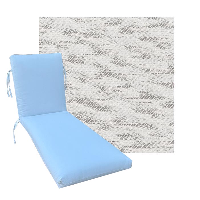 Classic Style Chaise Lounge Cushion. Premium Universal Chaise Lounge Replacement Cushions in 3 common sizes. Simple center seam design. No piping. Designed to accommodate aluminum, wood, and PVC furniture. Includes fabric ties at back and hinge. Polyester/densified fiber fill.