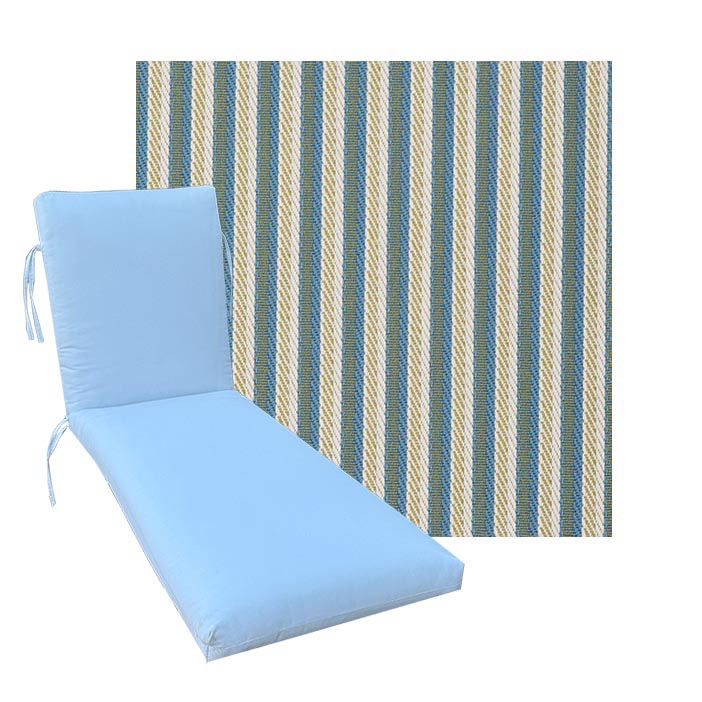 Classic Style Chaise Lounge Cushion. Premium Universal Chaise Lounge Replacement Cushions in 3 common sizes. Simple center seam design. No piping. Designed to accommodate aluminum, wood, and PVC furniture. Includes fabric ties at back and hinge. Polyester/densified fiber fill.