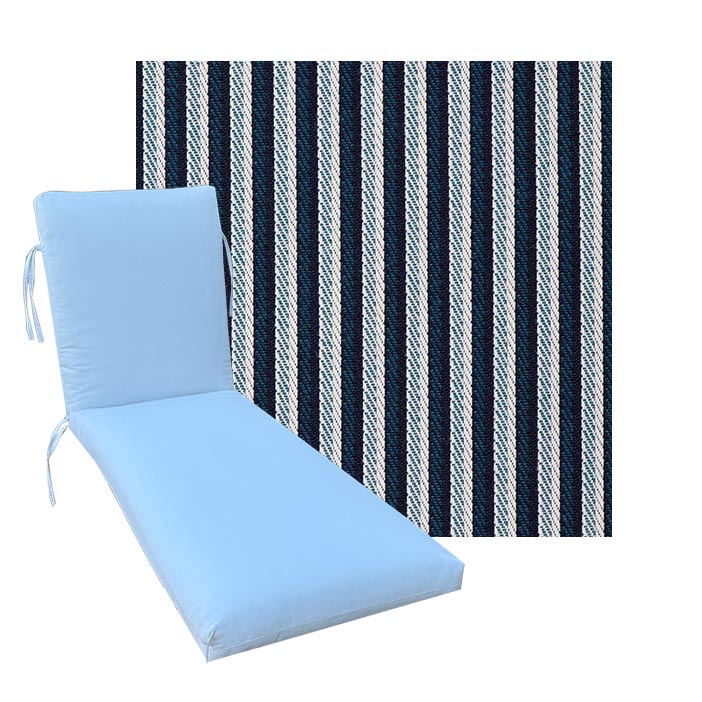 Classic Style Chaise Lounge Cushion. Premium Universal Chaise Lounge Replacement Cushions in 3 common sizes. Simple center seam design. No piping. Designed to accommodate aluminum, wood, and PVC furniture. Includes fabric ties at back and hinge. Polyester/densified fiber fill.