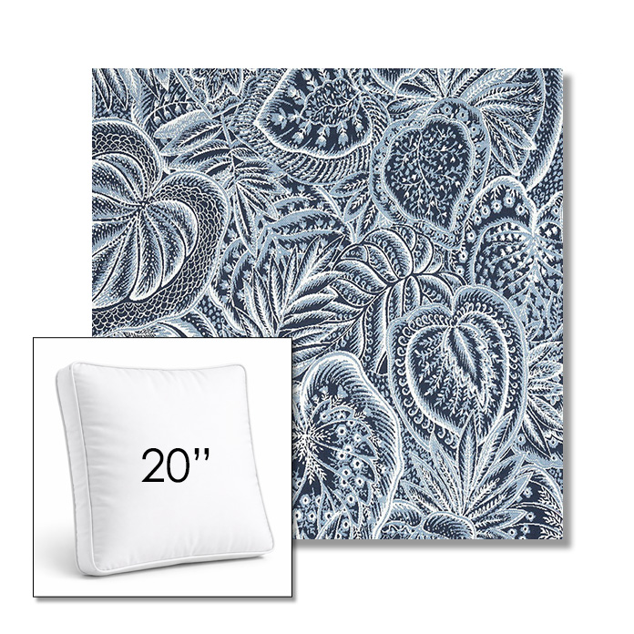 Custom 20" Square Boxed Sunbrella® Outdoor Pillow (3" Thick) available in over 700 Sunbrella® fabrics. Comes standard with piping. Optional covered button detail. Each pillow includes a zipper opening and premium outdoor insert for comfort, durability, and long-lasting outdoor performance.
