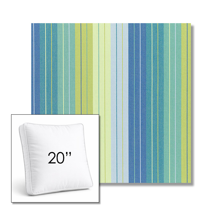 Custom 20" Square Boxed Sunbrella® Outdoor Pillow (3" Thick) available in over 700 Sunbrella® fabrics. Comes standard with piping. Optional covered button detail. Each pillow includes a zipper opening and premium outdoor insert for comfort, durability, and long-lasting outdoor performance.