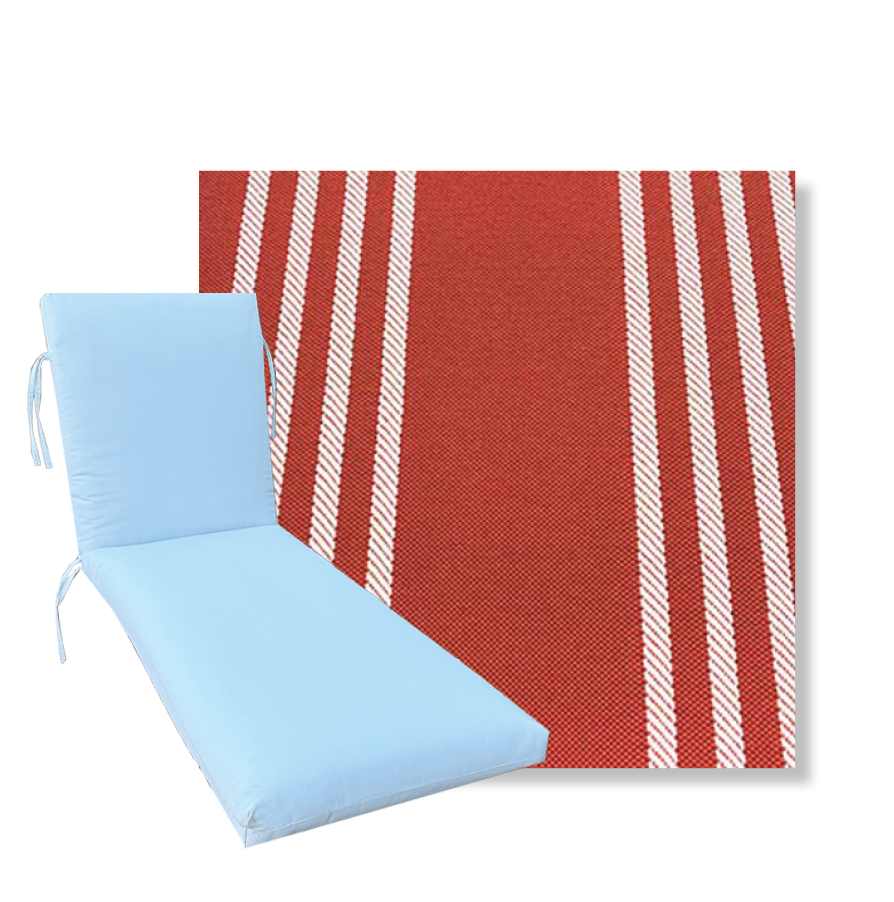 Classic Style Chaise Lounge Cushion. Premium Universal Chaise Lounge Replacement Cushions in 3 common sizes. Simple center seam design. No piping. Designed to accommodate aluminum, wood, and PVC furniture. Includes fabric ties at back and hinge. Polyester/densified fiber fill.