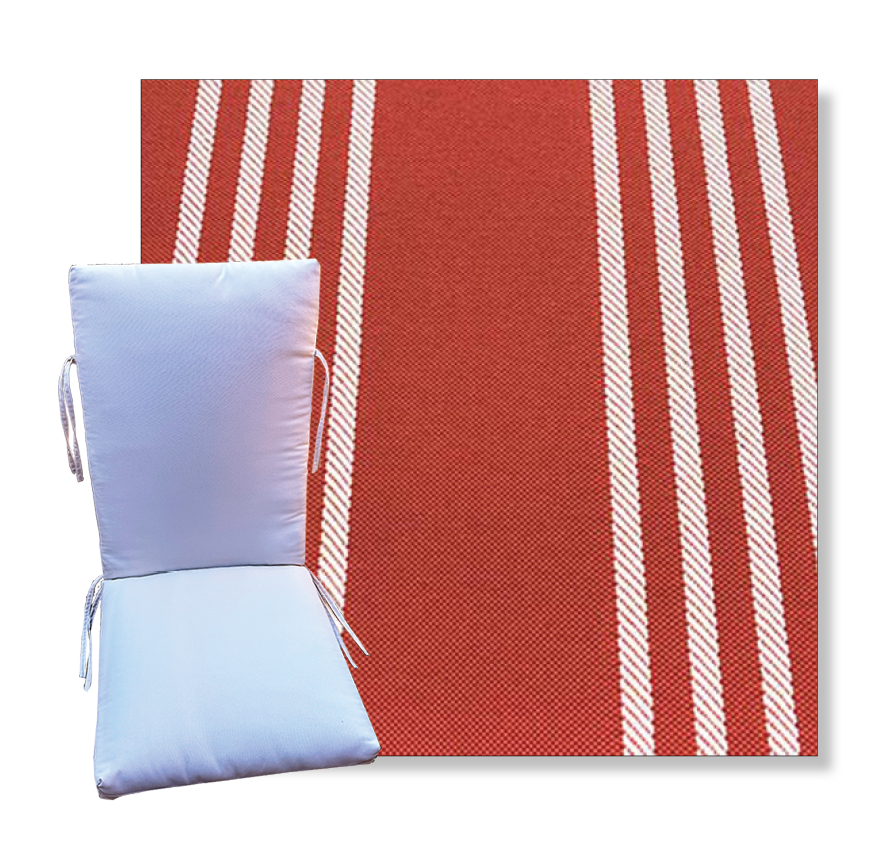Order universal patio chair cushions in Revolution Outdoor Fabrics - Find a new colorful replacement cushion in 9 sizes - This style of patio chair cushion features a center seam, hinged design with fabric ties. These outdoor cushions are custom made to order in the USA, in the fabric and size you need.