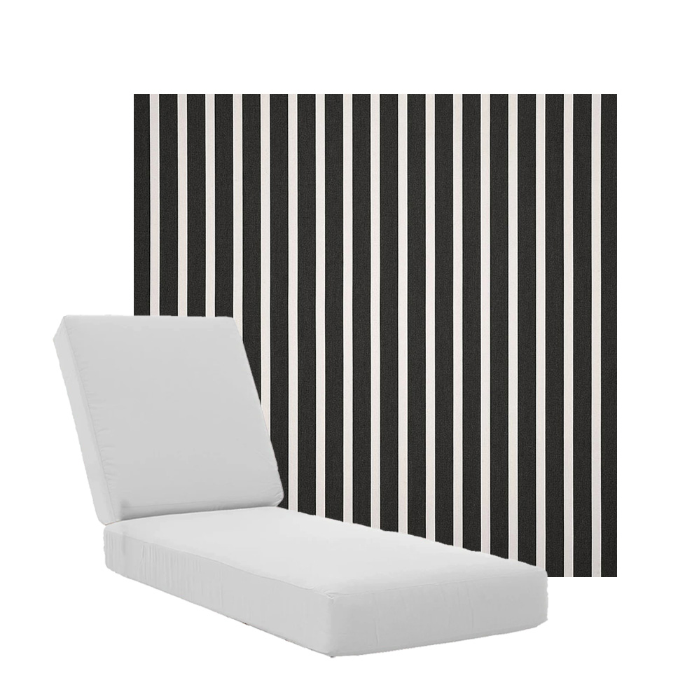 Boxed Chaise Lounge Cushions in Sunbrella Fabrics. Separate Seat and Back Cushions. Available in 3 sizes to fit a variety of outdoor furniture styles. Our boxed Chaise Lounge Cushions feature foam and fiber, piping and zipper openings. All chaise lounge replacement cushions are custom made to order in your choice of fabric and size. Made in the USA. Lead times may vary depending on the time of year.