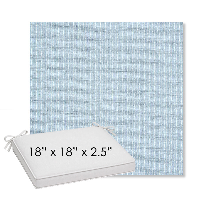 18" x 18" x 2.5" Thick outdoor dining chair seat cushion designed for a simple, ready-to-order fit. Features a boxed construction with piping, fabric ties, and zipper opening. Made in 700+ Sunbrella® fabrics for long-lasting outdoor performance.
