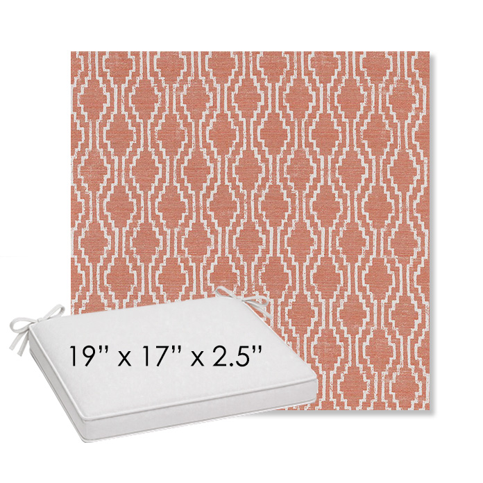 19" x 17" x 2.5" Thick outdoor dining chair seat cushion designed for a simple, ready-to-order fit. Features a boxed construction with piping, fabric ties, and zipper opening. Made in 700+ Sunbrella® fabrics for long-lasting outdoor performance.