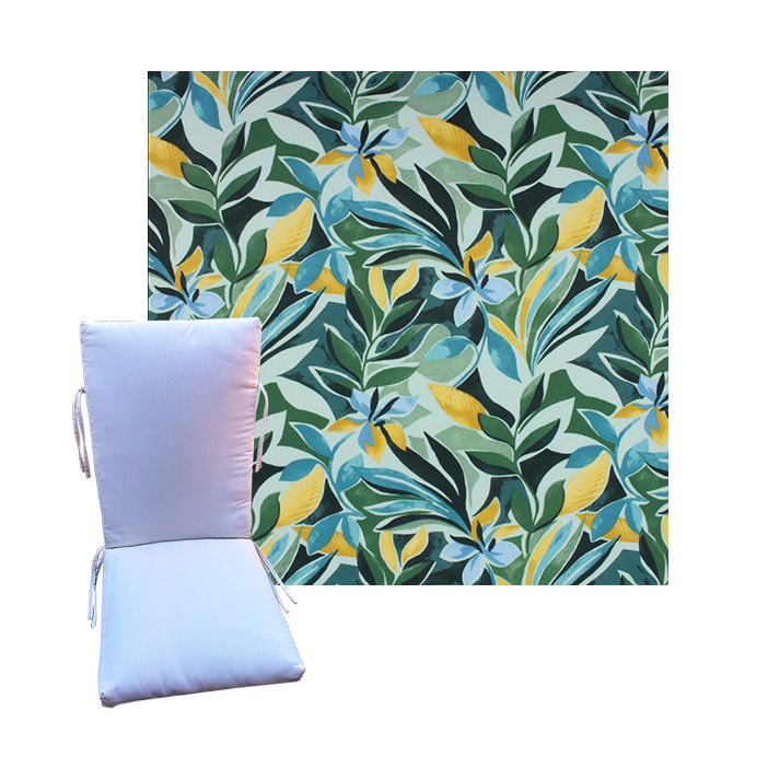 Order universal patio chair cushions in Richloom Solarium Outdoor Fabrics - Find a new colorful replacement cushion in 9 sizes - This style of patio chair cushion features a center seam, hinged design with fabric ties. These outdoor cushions are custom made to order in the fabric and size you need.