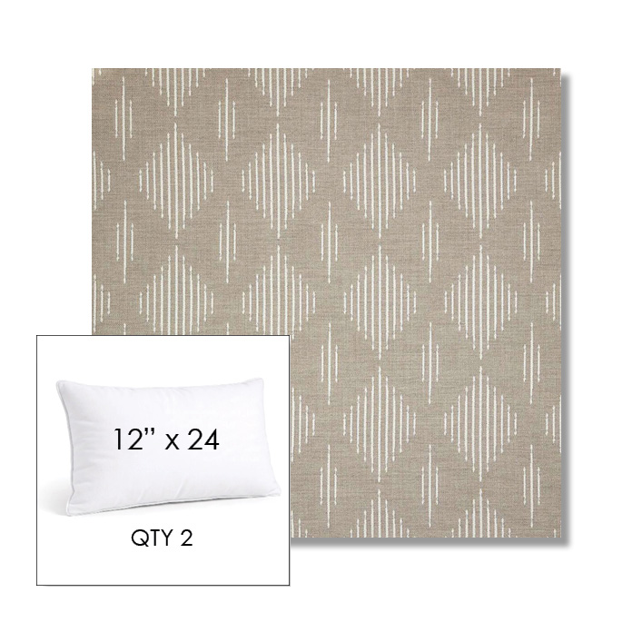 Custom 12" x 24" Lumbar Pillow SET OF TWO, square outdoor pillows available in over 700 Sunbrella® fabrics. Choose piping or knife-edge finish with optional covered button detail. Each pillow includes a zipper opening and premium outdoor insert for comfort, durability, and long-lasting outdoor performance.