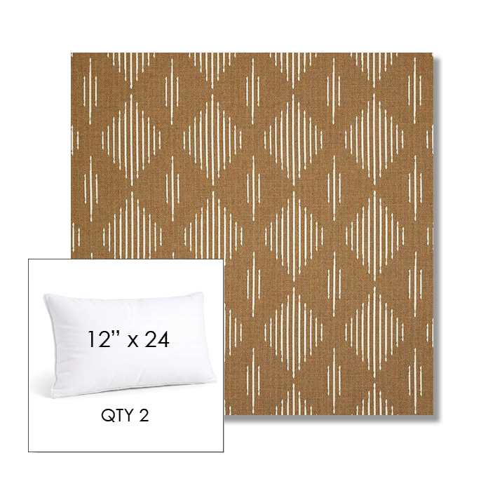 Custom 12" x 24" Lumbar Pillow SET OF TWO, square outdoor pillows available in over 700 Sunbrella® fabrics. Choose piping or knife-edge finish with optional covered button detail. Each pillow includes a zipper opening and premium outdoor insert for comfort, durability, and long-lasting outdoor performance.