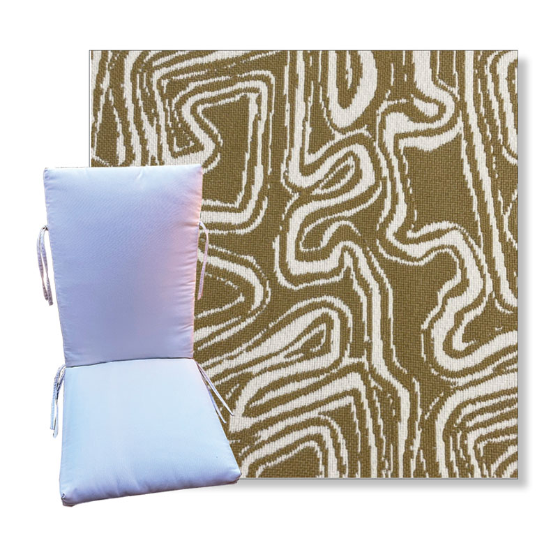 Order universal patio chair cushions in Revolution Outdoor Fabrics - Find a new colorful replacement cushion in 9 sizes - This style of patio chair cushion features a center seam, hinged design with fabric ties. These outdoor cushions are custom made to order in the fabric and size you need.