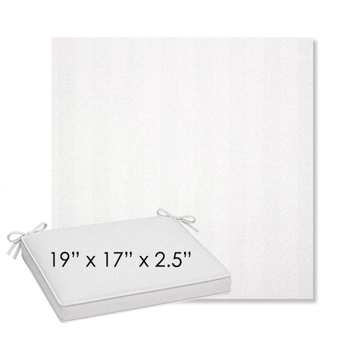 19" x 17" x 2.5" Thick outdoor dining chair seat cushion designed for a simple, ready-to-order fit. Features a boxed construction with piping, fabric ties, and zipper opening. Made in 700+ Sunbrella® fabrics for long-lasting outdoor performance.