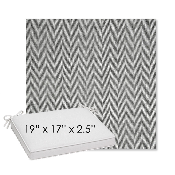 19" x 17" x 2.5" Thick outdoor dining chair seat cushion designed for a simple, ready-to-order fit. Features a boxed construction with piping, fabric ties, and zipper opening. Made in 700+ Sunbrella® fabrics for long-lasting outdoor performance.
