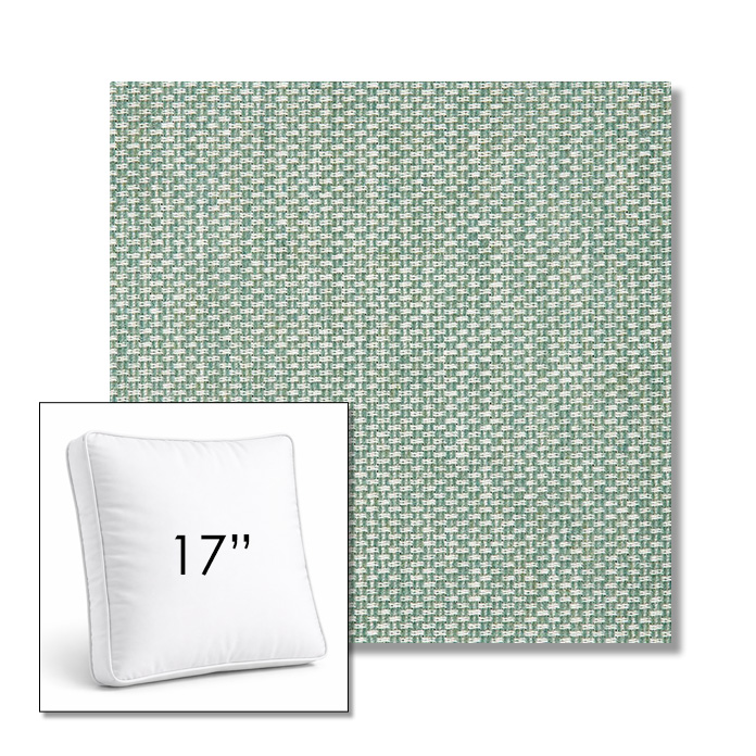 Custom 17" Square Boxed Sunbrella® Outdoor Pillow (3" Thick) available in over 700 Sunbrella® fabrics. Comes standard with piping. Optional covered button detail. Each pillow includes a zipper opening and premium outdoor insert for comfort, durability, and long-lasting outdoor performance.