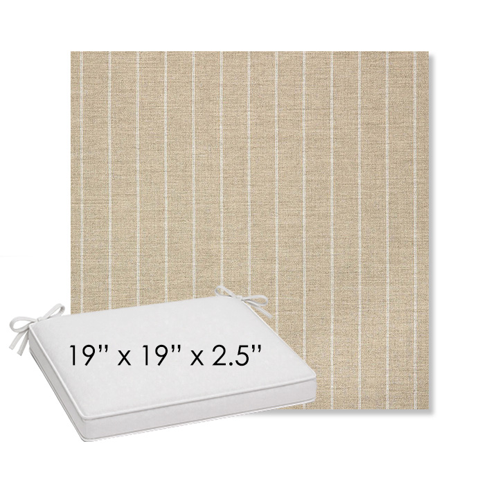 19" x 19" x 2.5" Thick outdoor dining chair seat cushion designed for a simple, ready-to-order fit. Features a boxed construction with piping, fabric ties, and zipper opening. Made in 700+ Sunbrella® fabrics for long-lasting outdoor performance.