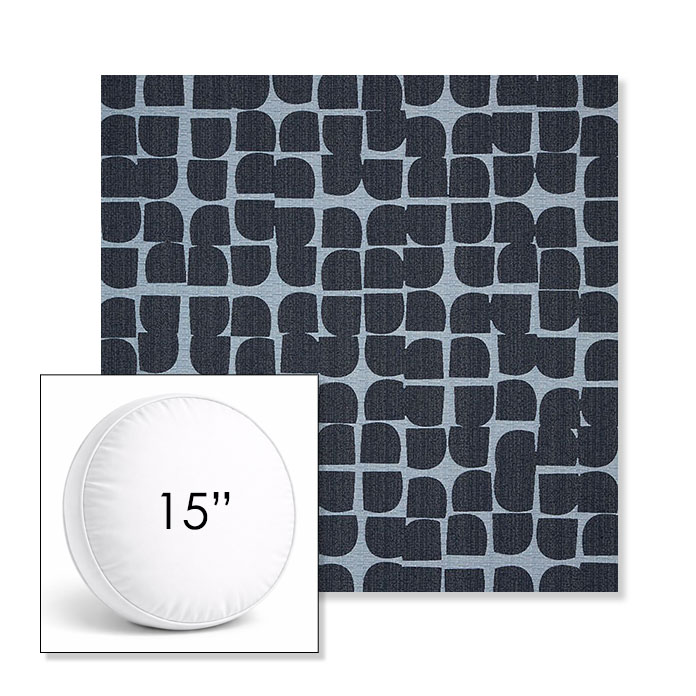 Custom 15" Round Boxed Sunbrella® Outdoor Pillow (3" Thick) available in over 700 Sunbrella® fabrics. Comes standard with piping. Optional covered button detail. Each pillow includes a zipper opening and premium outdoor insert for comfort, durability, and long-lasting outdoor performance.