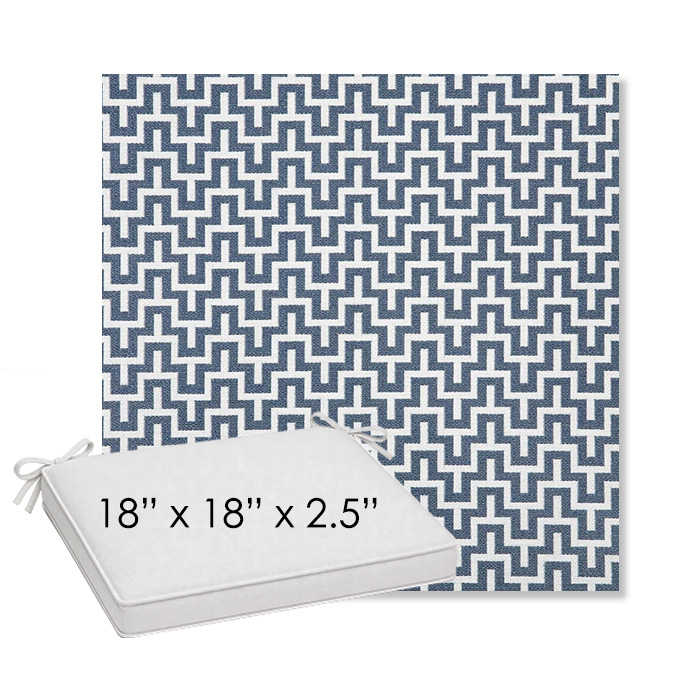 18" x 18" x 2.5" Thick outdoor dining chair seat cushion designed for a simple, ready-to-order fit. Features a boxed construction with piping, fabric ties, and zipper opening. Made in 700+ Sunbrella® fabrics for long-lasting outdoor performance.