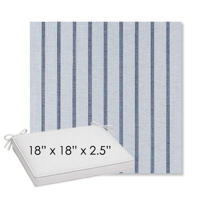 18" x 18" x 2.5" Thick outdoor dining chair seat cushion designed for a simple, ready-to-order fit. Features a boxed construction with piping, fabric ties, and zipper opening. Made in 700+ Sunbrella® fabrics for long-lasting outdoor performance.