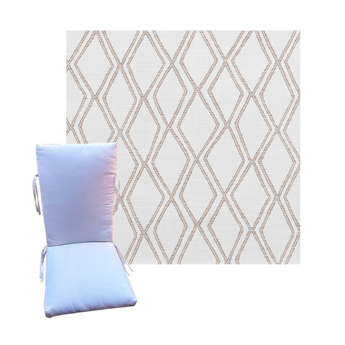 Order universal patio chair cushions in Sunbrella Outdoor Fabrics - Find a new colorful replacement cushion in 9 sizes - This style of patio chair cushion features a center seam, hinged design with fabric ties. These outdoor cushions are custom made to order in the fabric and size you need.