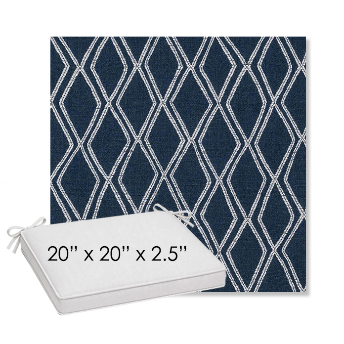 20" x 20" x 2.5" Thick outdoor dining chair seat cushion designed for a simple, ready-to-order fit. Features a boxed construction with piping, fabric ties, and zipper opening. Made in 700+ Sunbrella® fabrics for long-lasting outdoor performance.