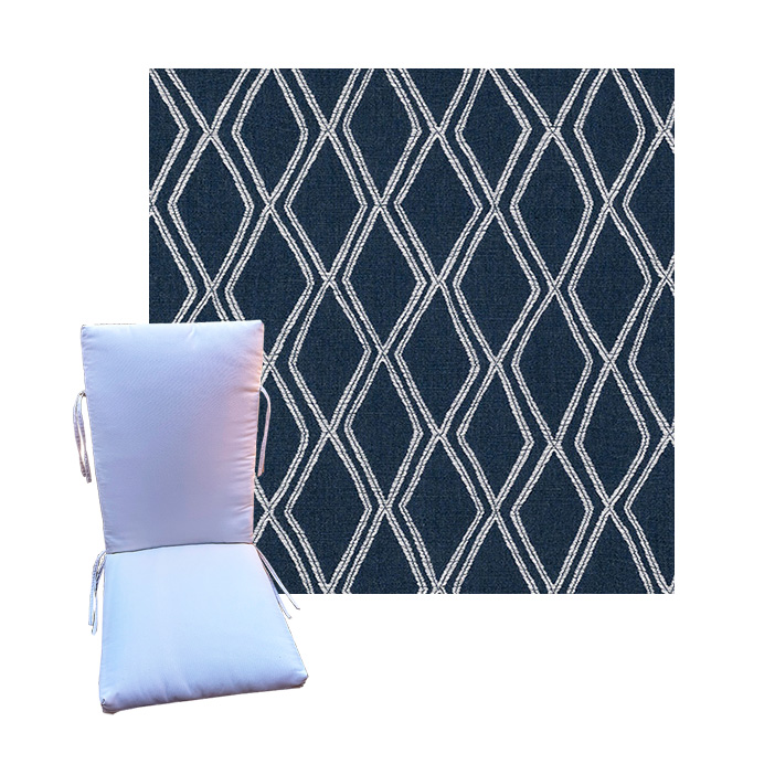 Order universal patio chair cushions in Sunbrella Outdoor Fabrics - Find a new colorful replacement cushion in 9 sizes - This style of patio chair cushion features a center seam, hinged design with fabric ties. These outdoor cushions are custom made to order in the fabric and size you need.