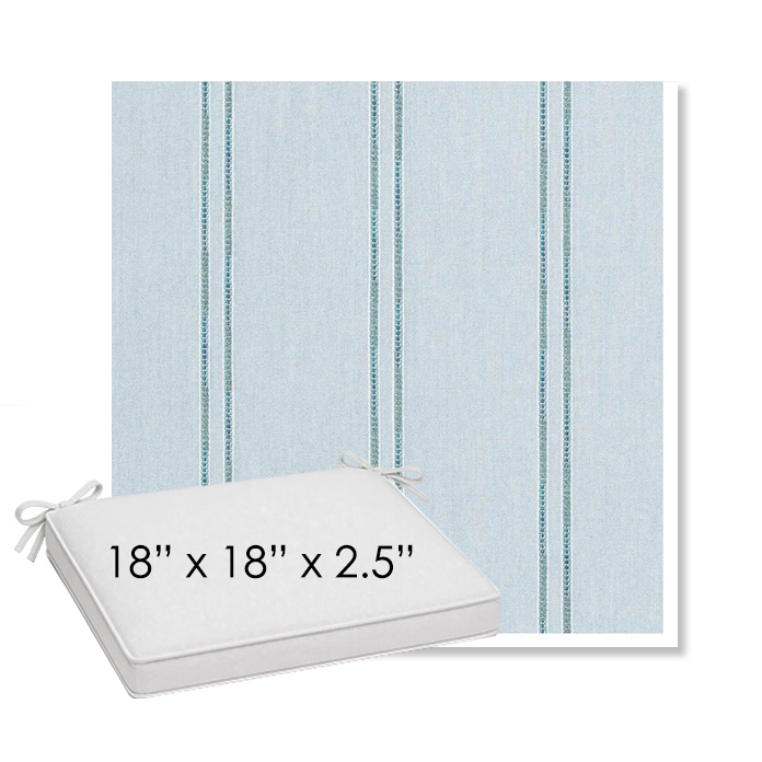18" x 18" x 2.5" Thick outdoor dining chair seat cushion designed for a simple, ready-to-order fit. Features a boxed construction with piping, fabric ties, and zipper opening. Made in 700+ Sunbrella® fabrics for long-lasting outdoor performance.