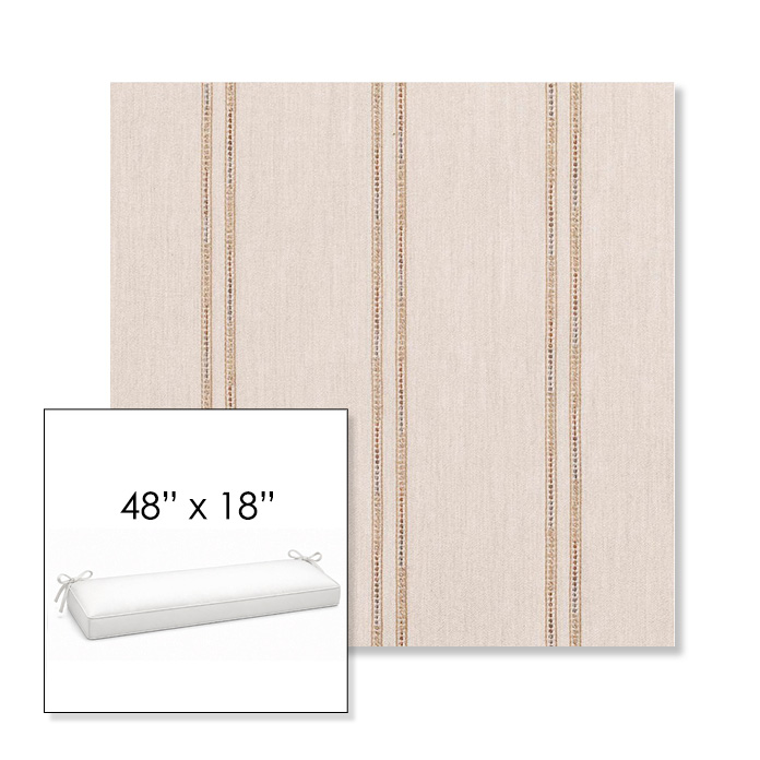 48" outdoor bench cushion designed for a simple, ready-to-order fit. Features a boxed construction with piping, fabric ties, and zipper opening. Made in 700+ Sunbrella® fabrics for long-lasting outdoor performance.